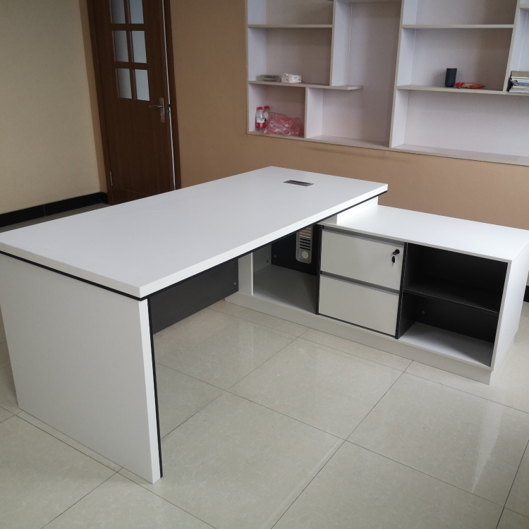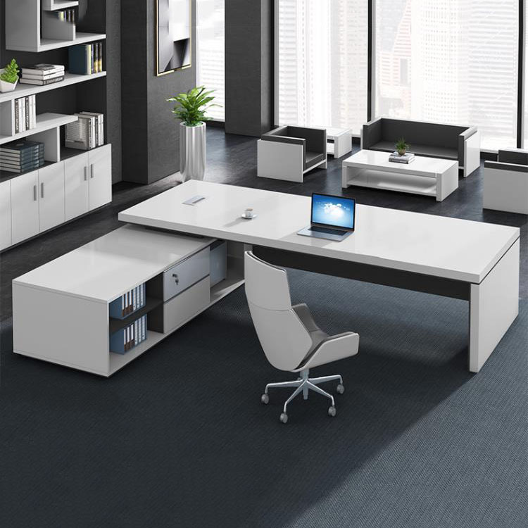مكتب تنفيذي خشبي أبيض على شكل حرف L