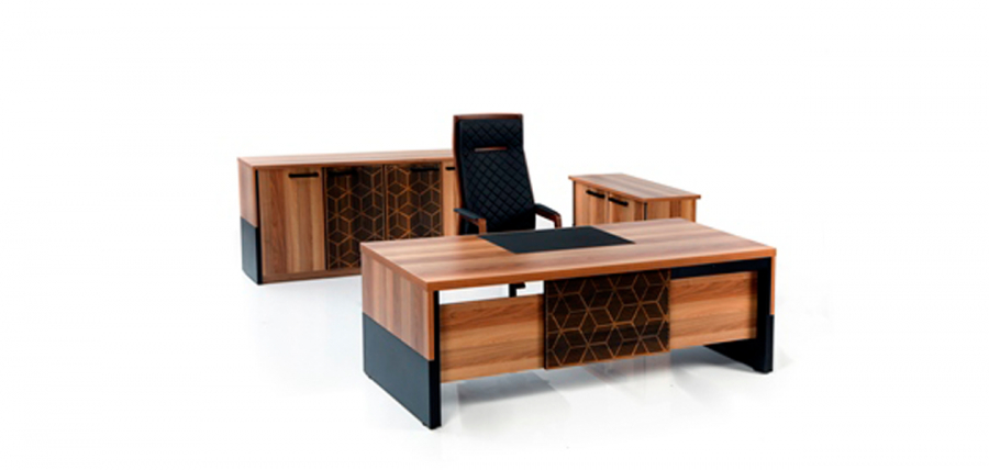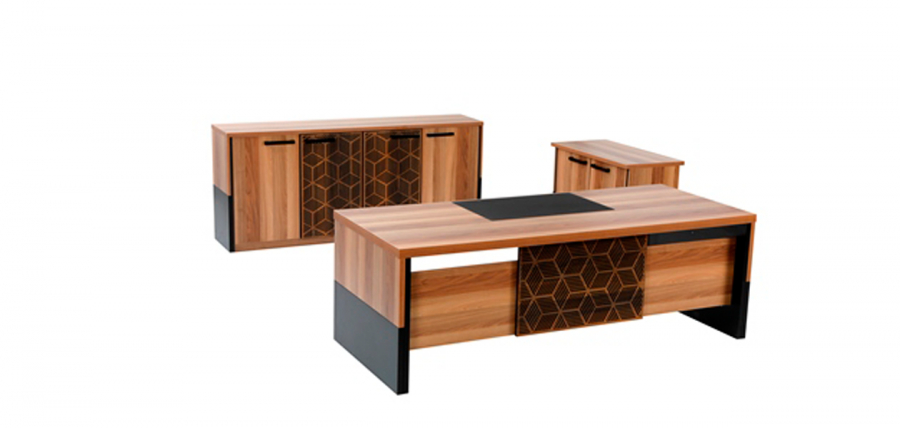 المكتب مصنوع من خشب عالي الجودة بتشطيب طبيعي جذاب، مع زخارف هندسية عصرية تضيف لمسة مميزة للتصميم.