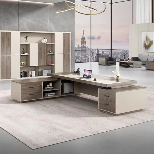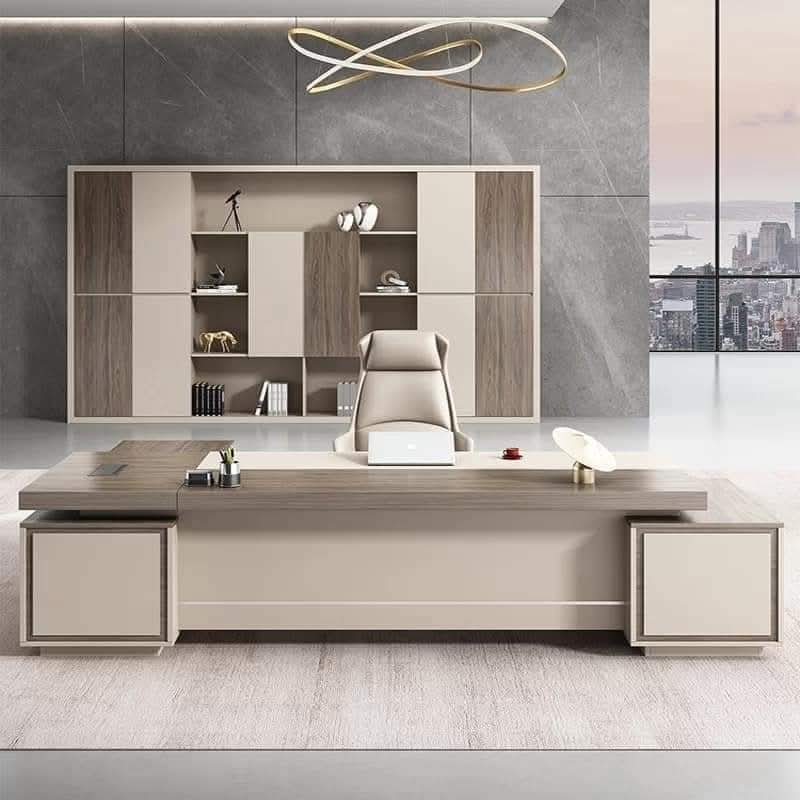 مكتب إداري فاخر بتصميم مودرن مع وحدة تخزين خلفية – مثالي للمكاتب التنفيذية
